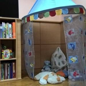 Центар за осамљивање који се налази поред литералног дела, омогућује деци да се осаме, узму жељену књигу, посматрају, читају и листају.