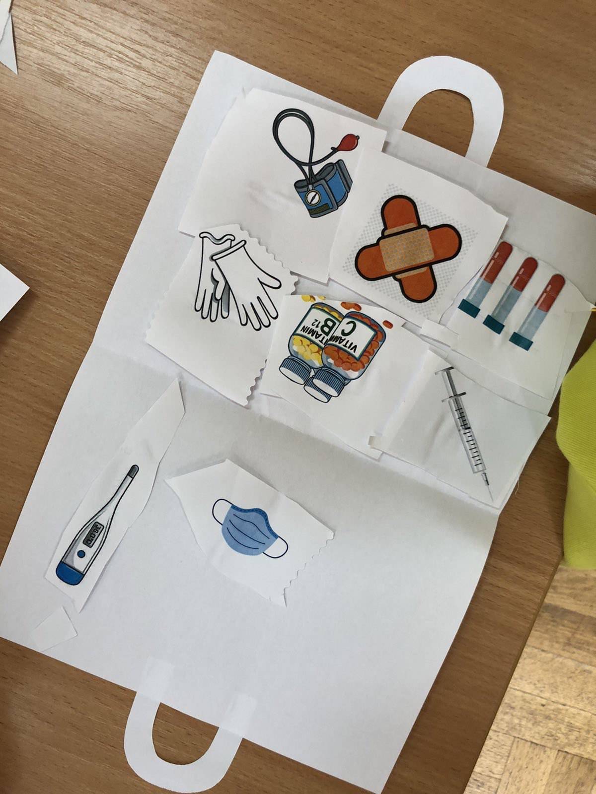 Правили су и своје торбице за прву помоћ. Прво су сецкали предмете које су желели да им се нађу у торбици а потом су их лепили.