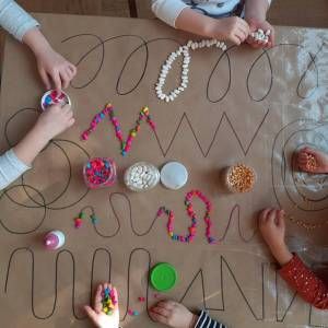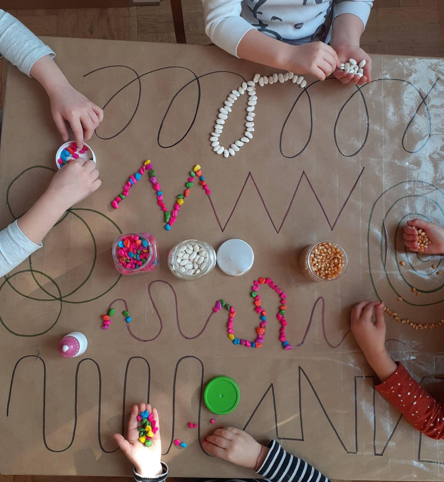 У оквиру сензо-моторне целине деца ређају природне материјале по линијама.