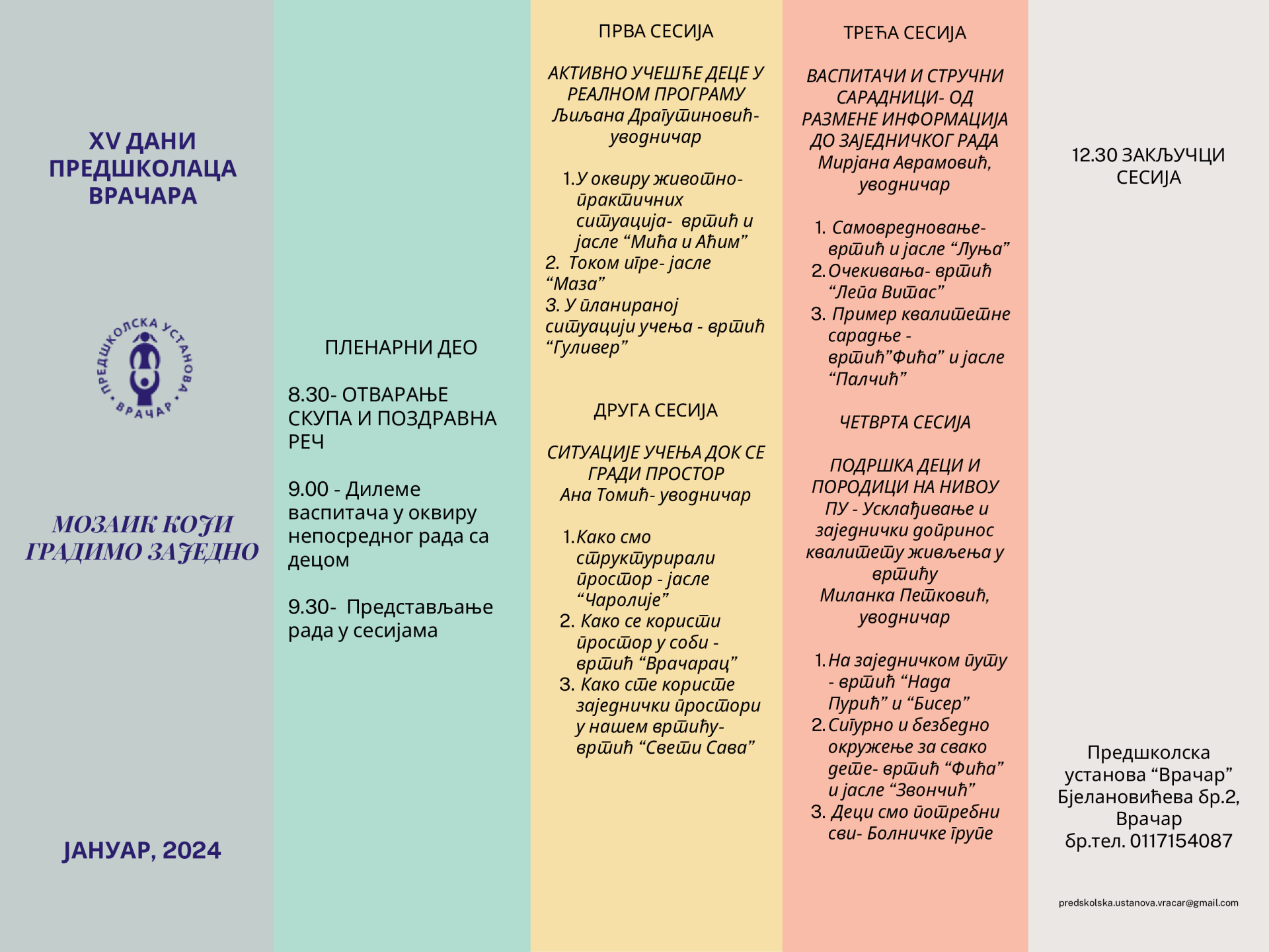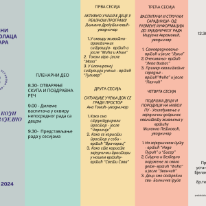Након уводних обраћања уследио је рад по сесијама на теме: „Активно учешће деце у реалном програму“, „Ситуације учења док се гради простор“, Васпитачи и стручни сарадници – Од размене информација до заједничког рада“ и „Подршка деци на породичном нивоу ПУ – Усклађивање и заједнички допринос квалитету живљења у вртићу.“