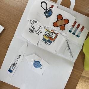Правили су и своје торбице за прву помоћ. Прво су сецкали предмете које су желели да им се нађу у торбици а потом су их лепили.