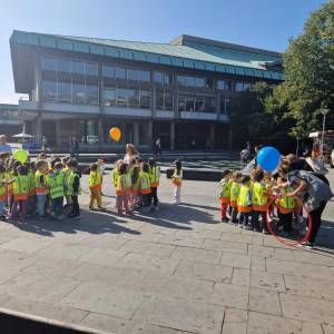 Пуштени су балони пријатељства. Деца су пуштала балоне у боји своје групе.