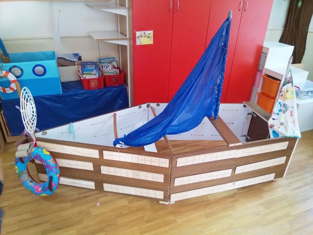 У овом месецу смо завршили наш пројекат „Од ћебета до брода“. Конструисан је велики брод у коме су учествовала деца и васпитачи. Брод је уз помоћ точкова постао мобилан и представља најлепшу целину наше собе, коју деца могу свакодневно премештати. Такође, прославили смо и наш пројекат, али на другачији начин него до сада. Деца су се костимирала и представила свој пројекат кроз две композиције у броду, које смо снимили и послали родитељима на Вибер групу.